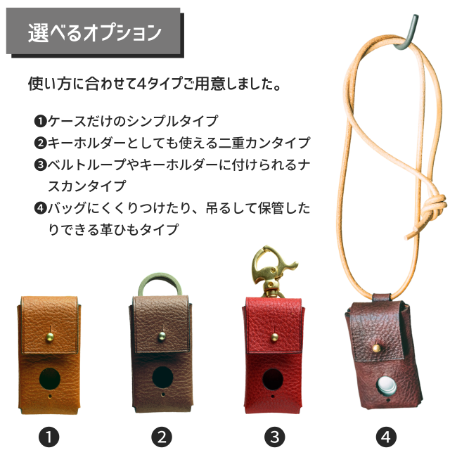 オプションは革ひも・ナスカン金具・二重カン・ナシの4種類