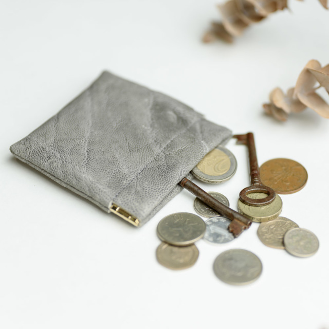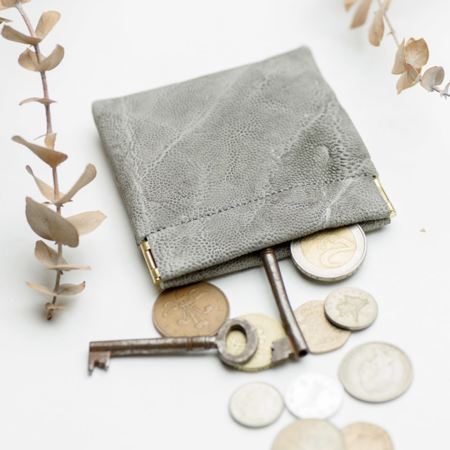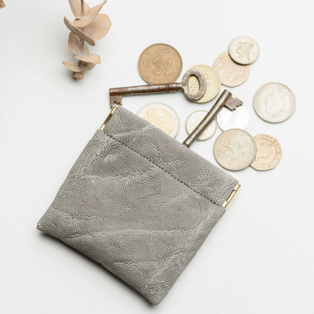 片手で開閉できるスリムな小銭入れです。ケースの端を握ることでワンタッチ開閉が可能なコインケース。アクセサリーケースとしても有用で、仕事中にアクセサリーをはずす必要がある場合や、保管用としても使えます。とても希少な象革を使用。ワイルドな表情が個性を発揮します。