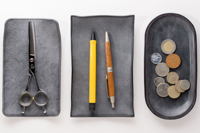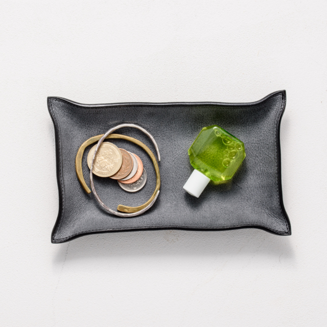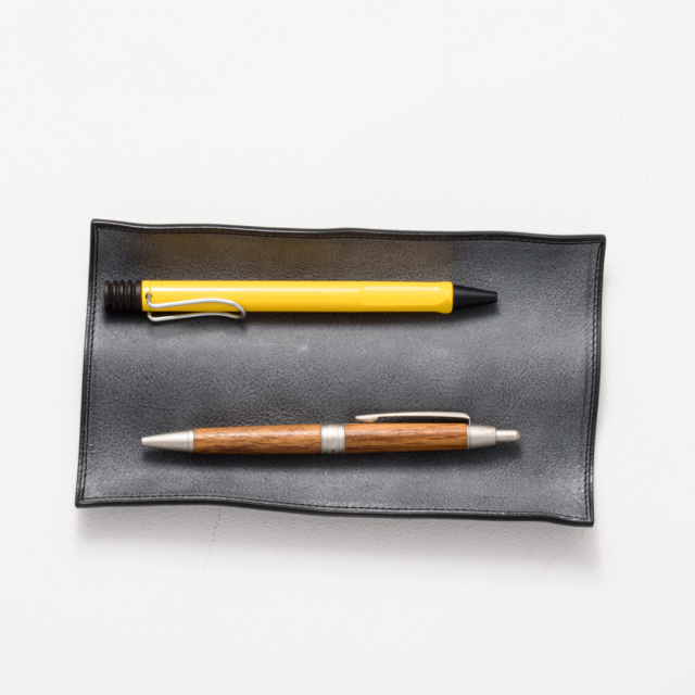 革のトレーです。キャッシュトレイ以外にも、ペントレーや眼鏡/アクセサリートレイ、店舗用の商品ディスプレイなど、多用途にお使いいただけます。イタリア製の蝋引き革を使用しました。使い込むと白い蝋が取れ、革地が見えていきます。使い込むほどに光沢の出る革なので、時の移ろいを感じながら使う楽しみがございます。