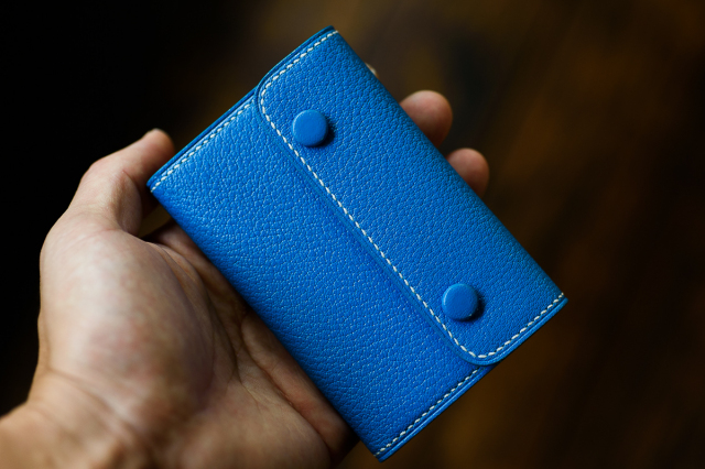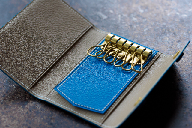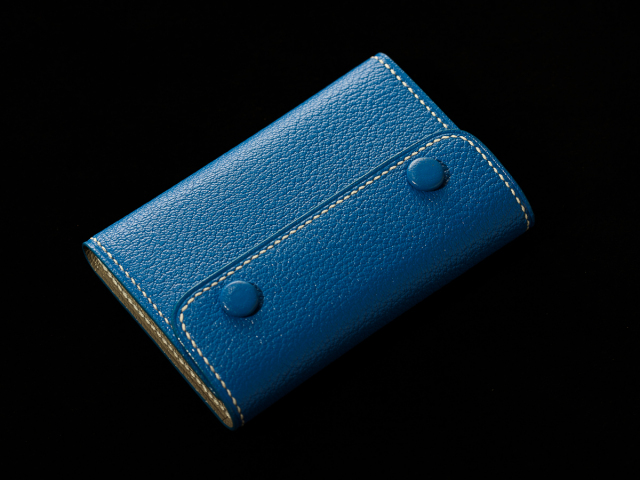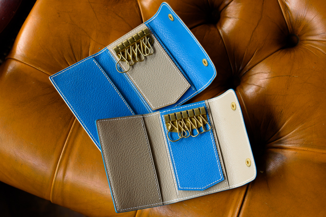 手縫いで制作したキーケース。カードポケットが2つ備わっています。