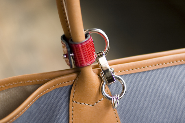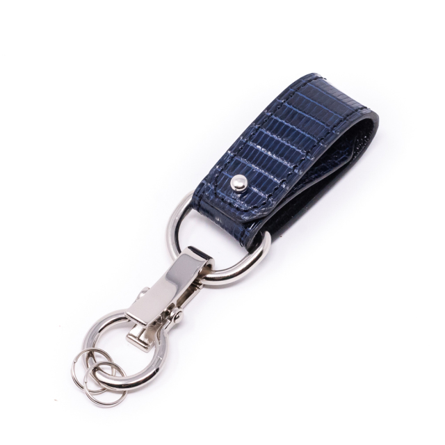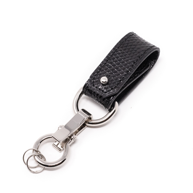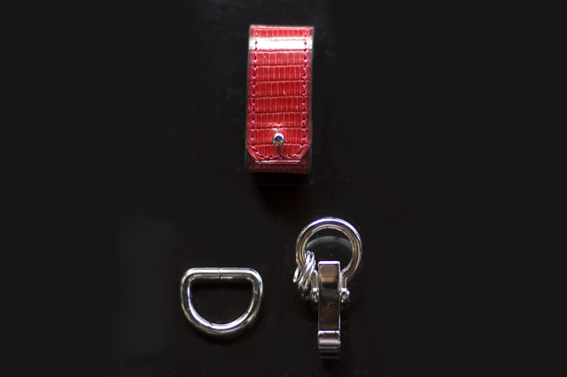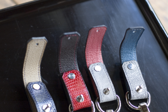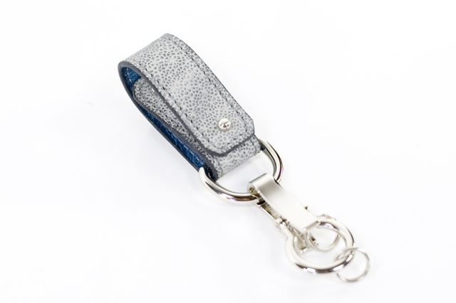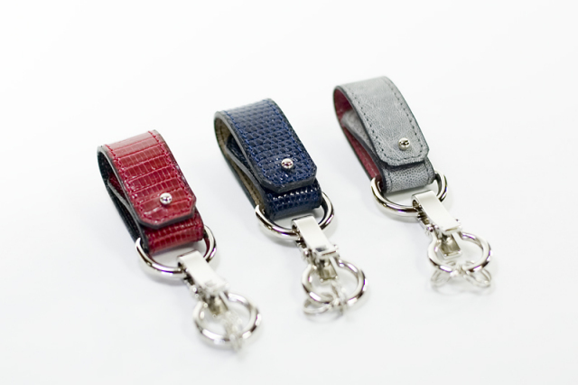 それぞれに経年変化が楽しめる真鍮金具と牛革を使用したカジュアルなイタリア産牛革モデルと違い、ビジネスにも向くシルバー色の金具やエキゾチックレザーを使用したハイエンドモデルです。薄手の布や衣類に取り付けて使えます。