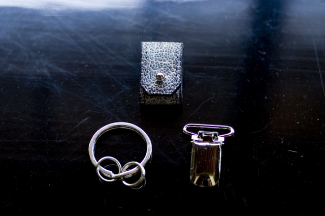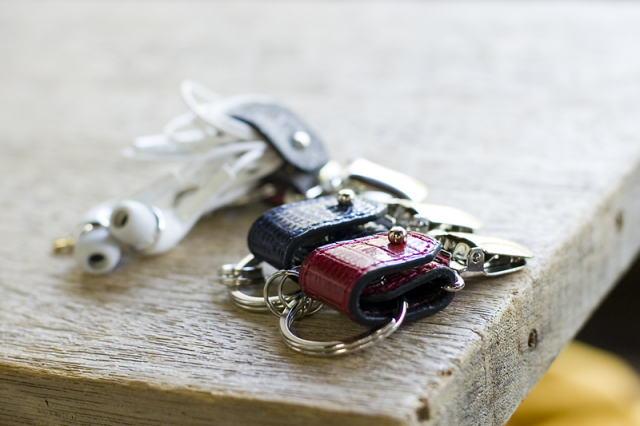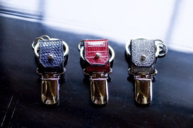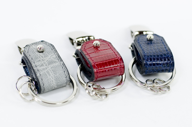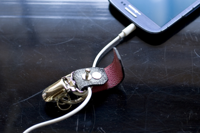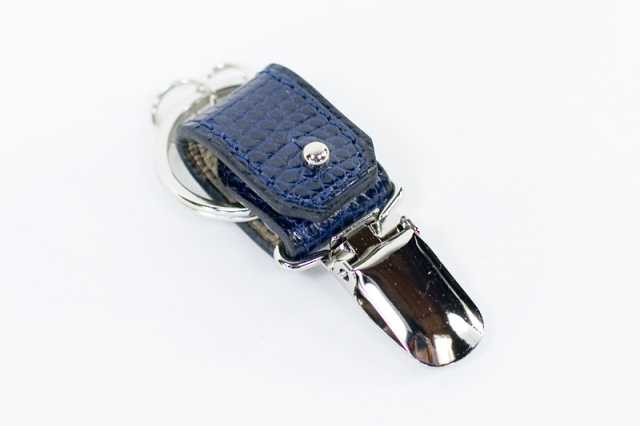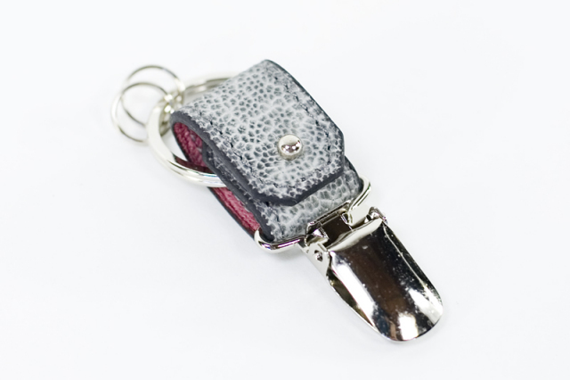 それぞれに経年変化が楽しめる真鍮金具と牛革を使用したカジュアルなイタリア産牛革モデルと違い、ビジネスにも向くシルバー色の金具やエキゾチックレザーを使用したハイエンドモデルです。薄手の布や衣類に取り付けて使えます。イヤホンコードを巻きつけて長さを調節する使い方がおすすめ。
